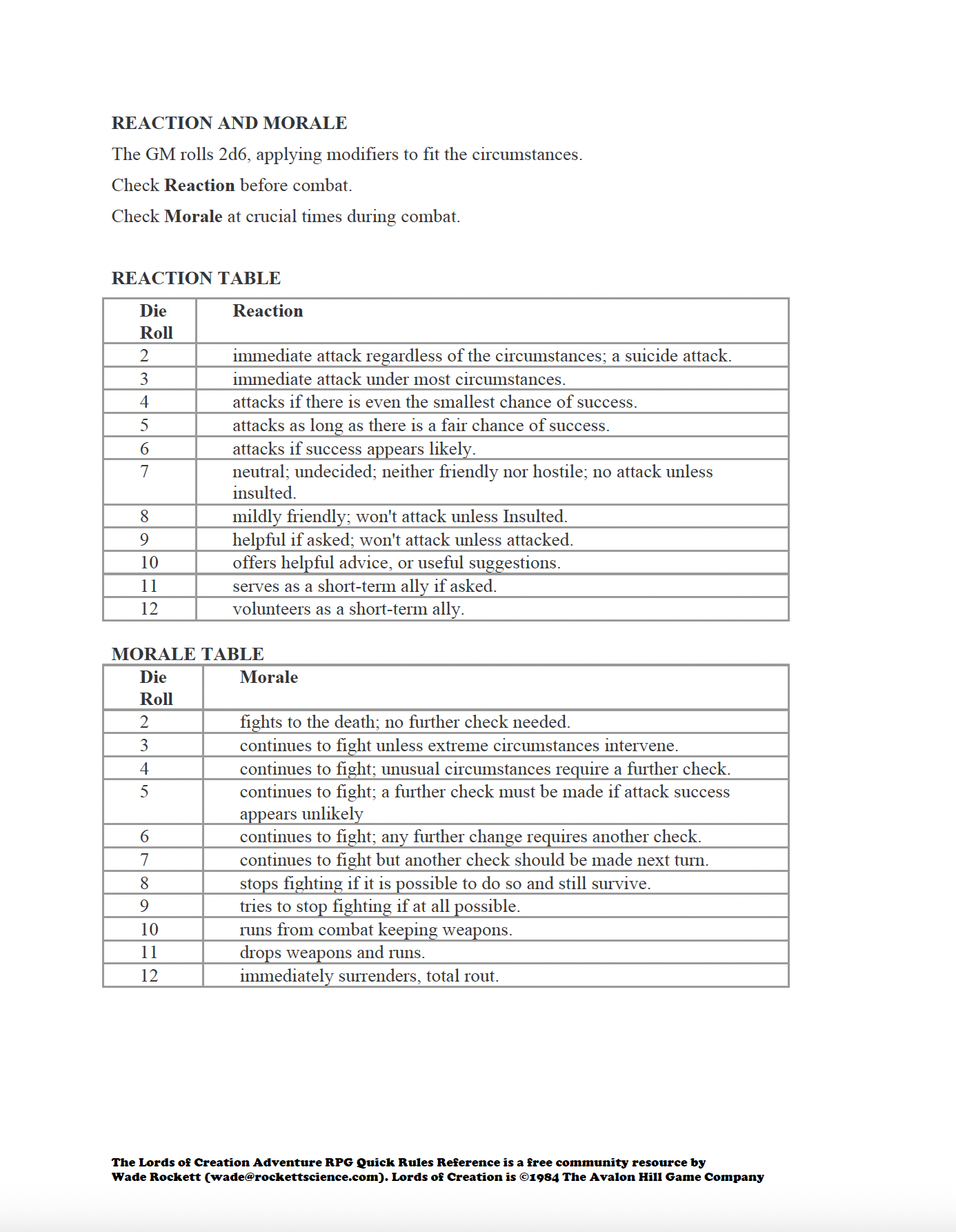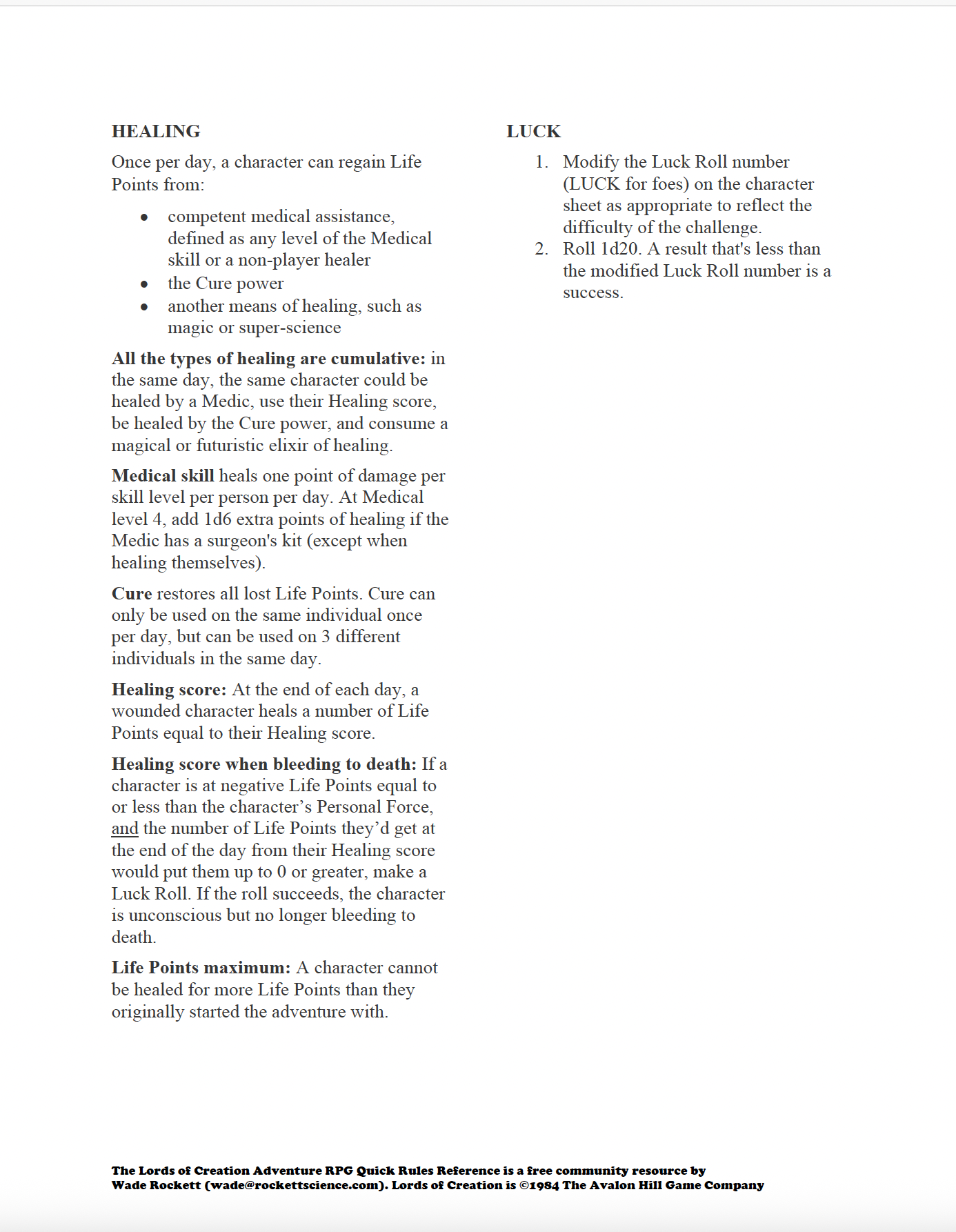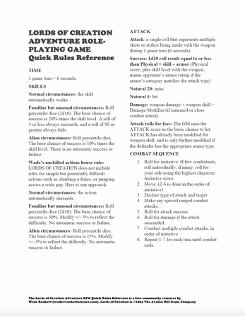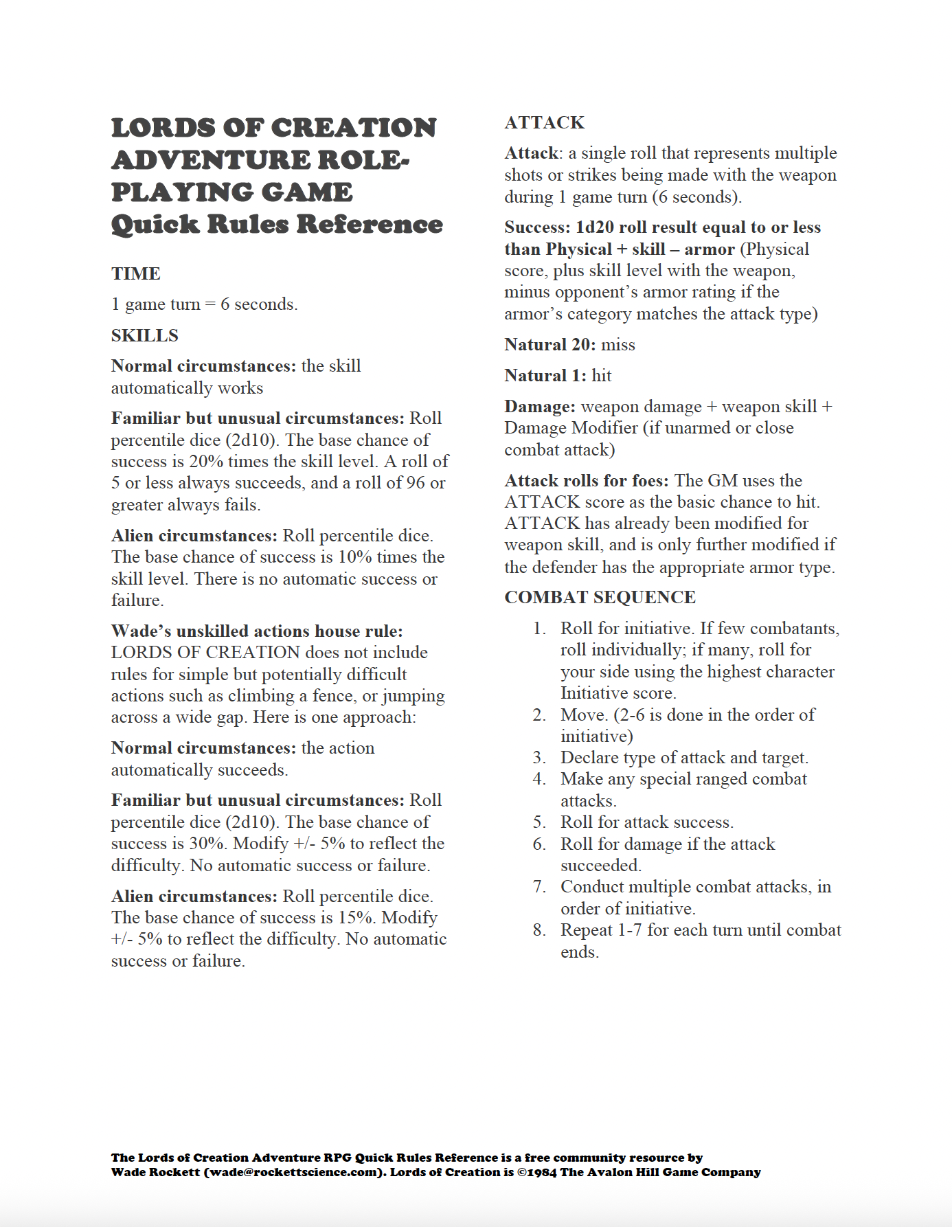 A free rules reference for the out-of-print science fantasy roleplaying game Lords of Creation by Tom Moldvay, published in 1984 by Avalon Hill.